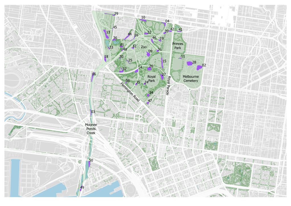 We’ve picked roughly 40 areas in and around Royal Park that we’re most interested in. You might like to choose one one your usual walking route, or venture somewhere a little different! Once you’ve picked your spot, you can select it from the dropdown menu in the BioCollect app and complete your survey. You can see the full map below.